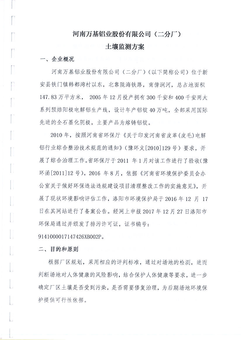 河南萬基鋁業(yè)股份有限公司(二分廠)2019土壤自行檢測方案